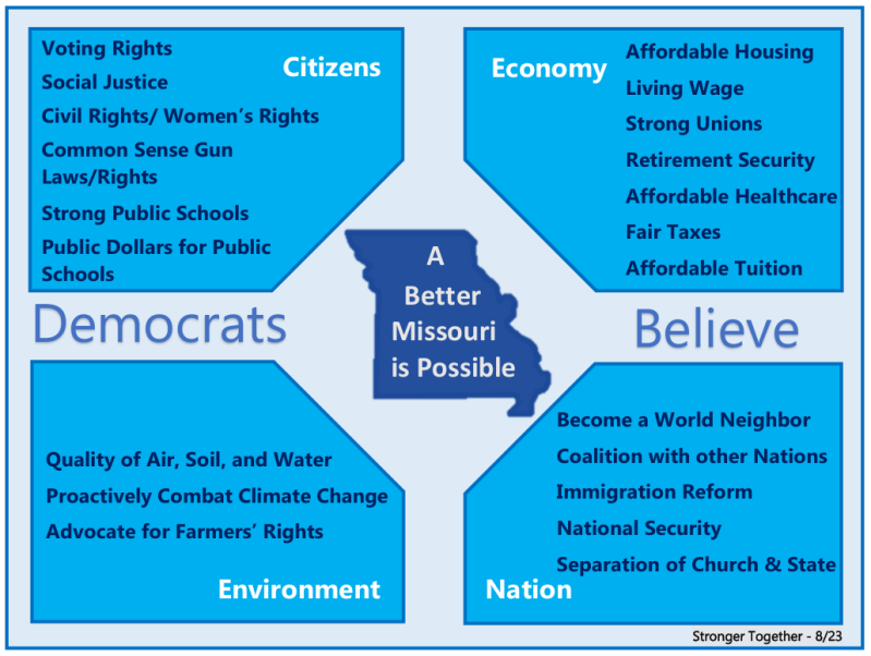 Our core belief is that a better Missouri is possible. By making policy decisions for citizens, nation, economy, and the environment Missouri can be a better place to live.